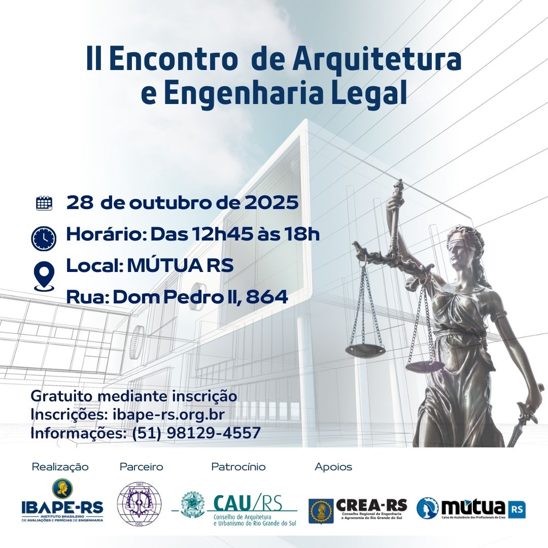 No dia 28 de outubro, o IBAPE-RS, em parceria com o IGEL, realiza o II Encontro de Arquitetura e Engenharia Legal – um espaço voltado à atualização profissional e à troca de experiências. O evento contará com renomados especialistas, que irão compartilhar conteúdos práticos e atuais para quem deseja atuar em avaliações e perícias com mais segurança e embasamento. Além do conhecimento técnico, os participantes terão a chance de ampliar sua rede de contatos com profissionais e instituições que estão transformando o cenário da arquitetura e engenharia legal. O encontro acontece na Sede da Mútua-RS, das 13h às 18h, com entrada gratuita. Não perca esta oportunidade de fortalecer sua atuação e expandir seus horizontes profissionais.